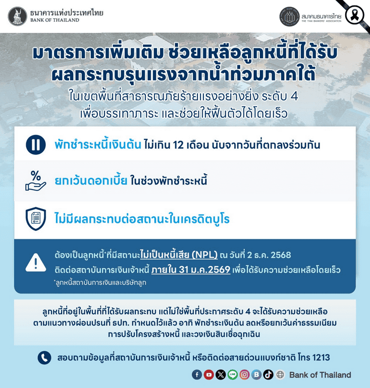 มาตรการช่วยเหลือเพิ่มเติมนี้ จะให้ความช่วยเหลือลูกหนี้ของ ธพ. และบริษัทลูกในกลุ่มฯ ที่ได้รับผลกระทบจากสาธารณภัยในเขตพื้นที่สาธารณภัยร้ายแรงอย่างยิ่ง (ระดับ 4) จนไม่สามารถชำระคืนหนี้ได้ตามปกติ ด้วยการพักชำระหนี้เงินต้นและยกเว้นดอกเบี้ยที่เกิดขึ้นในช่วงพักชำระหนี้ดังกล่าว เป็นระยะเวลาไม่เกิน 12 เดือนนับจากวันที่ลูกหนี้แจ้งความประสงค์หรือตอบรับ (opt-in) ให้กับลูกหนี้รายที่ไม่มีสถานะเป็นหนี้ที่ไม่ก่อให้เกิดรายได้ (Non-Performing Loan: NPL) ณ วันที่ 2 ธันวาคม 2568 โดยลูกหนี้ที่เข้าร่วมมาตรการจะไม่ได้รับผลกระทบต่อสถานะในเครดิตบูโร สำหรับมาตรการช่วยเหลือเพิ่มเติมนี้จะครอบคลุมลูกหนี้ ดังต่อไปนี้