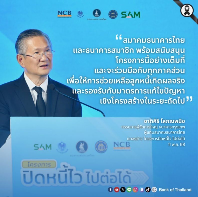 เมื่อวันที่ 11 พฤศจิกายน 2568 นายชาติศิริ โสภณพนิช กรรมการผู้จัดการใหญ่ ธนาคารกรุงเทพ จำกัด (มหาชน) ในฐานะผู้แทนสมาคมธนาคารไทย พร้อมด้วยคณะผู้บริหารระดับสูงของธนาคารสมาชิก เข้าร่วมแถลงเปิดโครงการ “ปิดหนี้ไว ไปต่อได้” หวังช่วยลูกหนี้เกือบ 2 ล้านบัญชี ปิดหนี้เสียเคลียร์ประวัติ ณ ห้องภัทรรวมใจ ชั้น 2 อาคาร 2 ธนาคารแห่งประเทศไทย พร้อมกล่าว ว่า “สมาคมธนาคารไทยและธนาคารสมาชิก พร้อมสนับสนุนโครงการนี้อย่างเต็มที่และจะร่วมมือกับทุกภาคส่วนเพื่อให้การช่วยเหลือลูกหนี้เกิดผลจริงและรองรับกับมาตรการแก้ไขปัญหาเชิงโครงสร้างในระยะถัดไป”